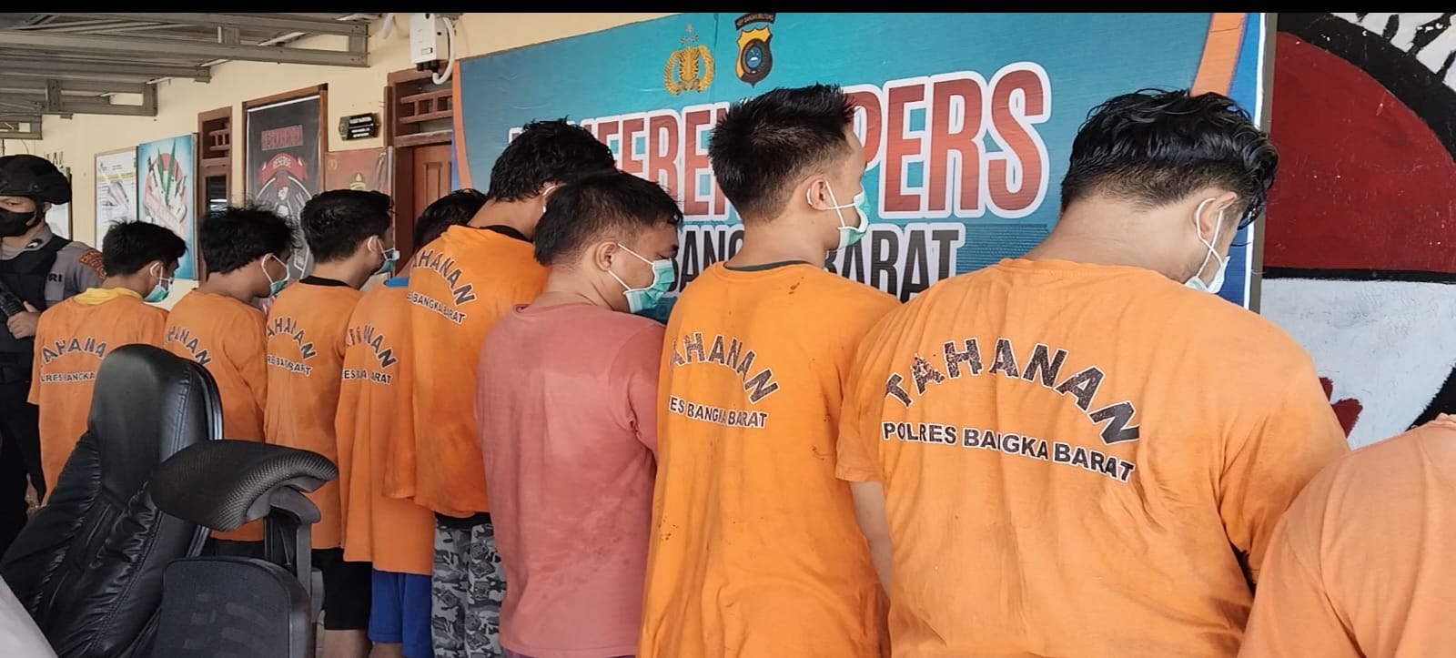 Dalam konfrensi pers di Mako Polres Babar, hanya 9 tersangka dihadirkan, sementara 9 lainnya sudah dititipkan ke Rutan Mentok, karena terbatasnya ruang tahanan di Polres Babar.