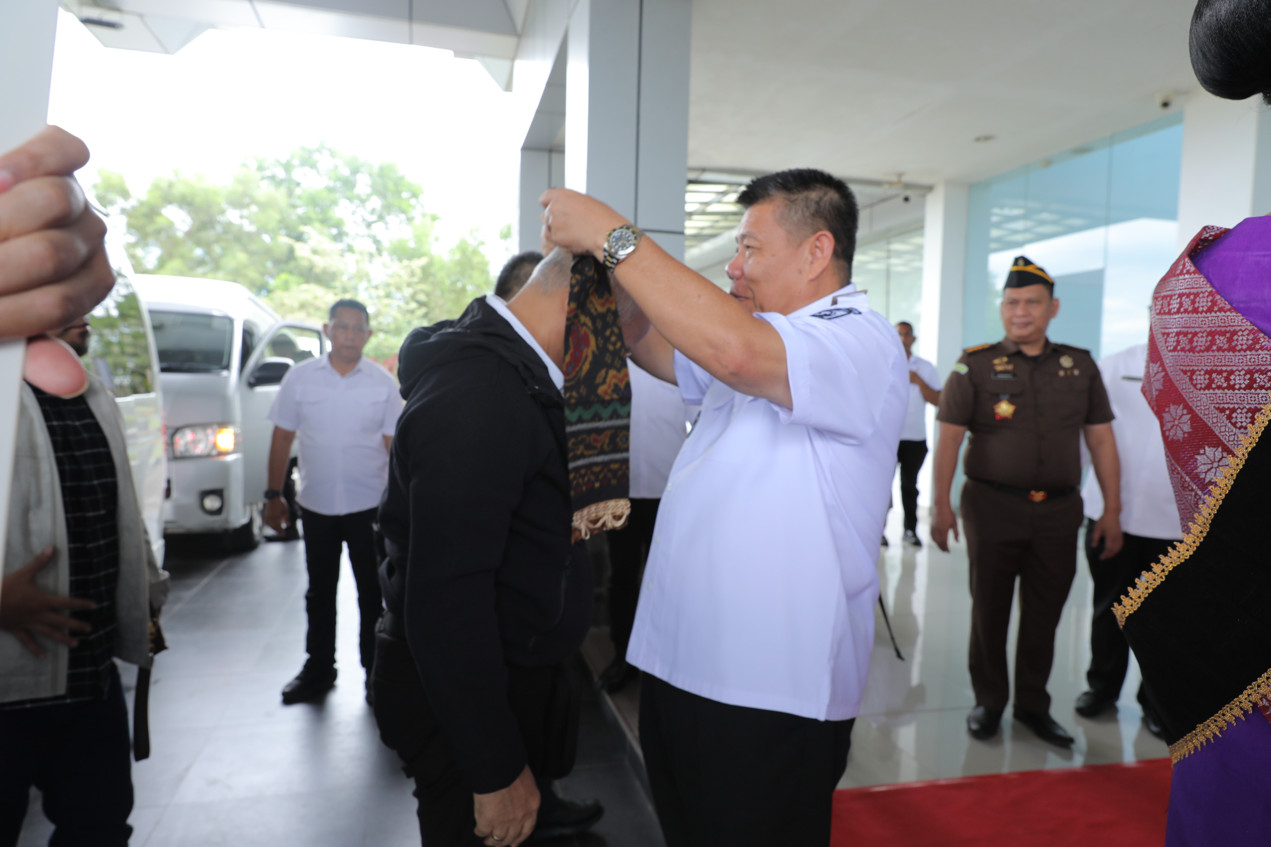 Prosesi penyambutan diwarnai dengan tradisi lokal berupa pemasangan topi dan syal cual khas Bangka Belitung sebagai bentuk penghormatan.