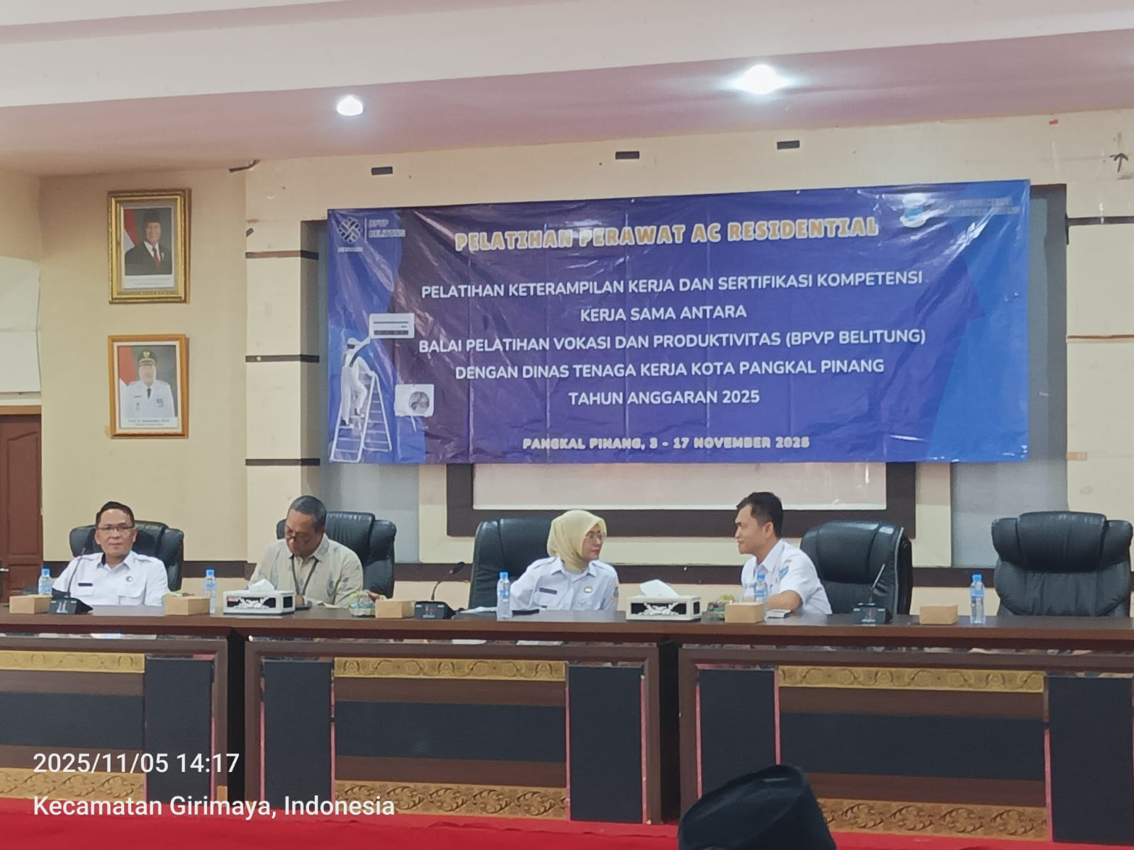 PANGKALPINANG – Wakil Wali Kota Pangkalpinang, Dessy Ayutrisna, secara resmi membuka Pelatihan Keterampilan Kerja Sertifikasi Kompetensi Teknisi Perawatan AC Residential Tahun Anggaran 2025, Rabu (5/11/2025), di Balai Betason Kantor Wali Kota.